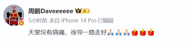 篮球解说员周鹏得知噩耗后,悲痛发文悼念:“天堂没有病痛,徐导一路走好!”