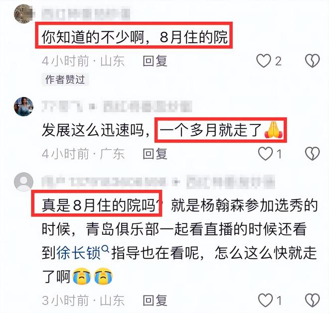 另外,有山东本地人告知,徐长锁8月份住的院,杨瀚森参加选秀的时候,青岛俱乐部一起看直播的时候还看到徐长锁指导也在呢,就病情发展得特别快。